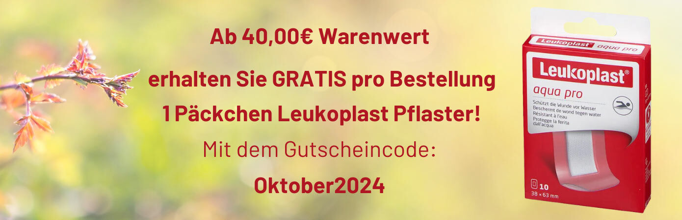 Unsere Herbst-Geschenkaktion läuft nur für kurze Zeit. Warten Sie nicht zu lange und bestellen Ihre Wunschartikel jetzt im Oktober, bevor der Vorrat an kostenlosen Leukoplast-Pflastern aufgebraucht ist.